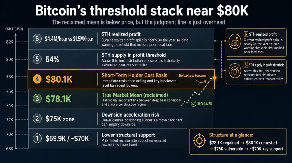 A chart maps Bitcoin’s key on-chain price thresholds from $69,900 to $82,000, highlighting the reclaimed True Market Mean at $78,100 and the Short-Term Holder Cost Basis resistance at $80,100.