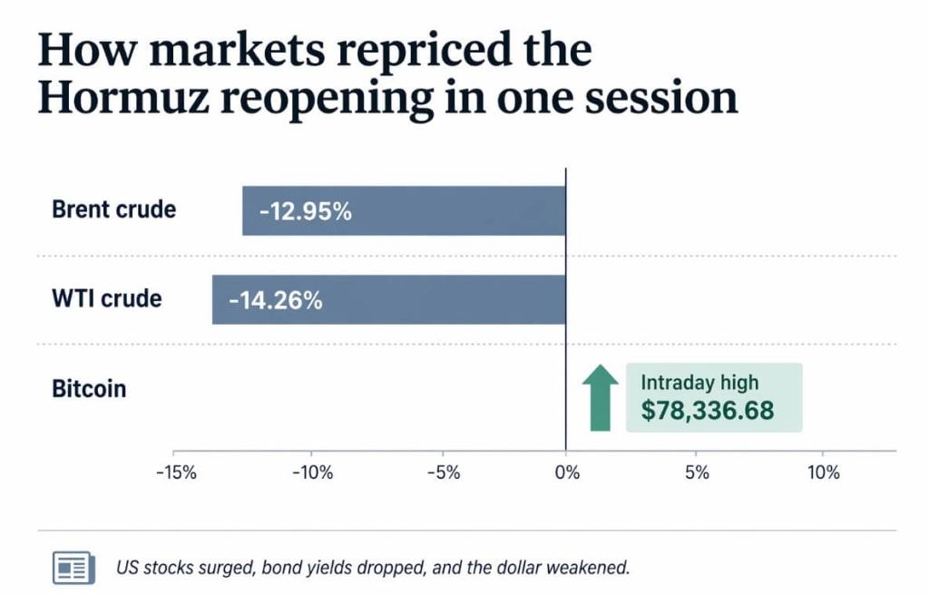 Brent crude fell 12.95% to $86.52, and WTI dropped 14.26% to $81.19, both their lowest levels since Mar. 11 and the largest single-day declines since Apr. 8. US stocks surged, bond yields dropped, the dollar weakened, and Bitcoin registered an intraday high of $78,336.