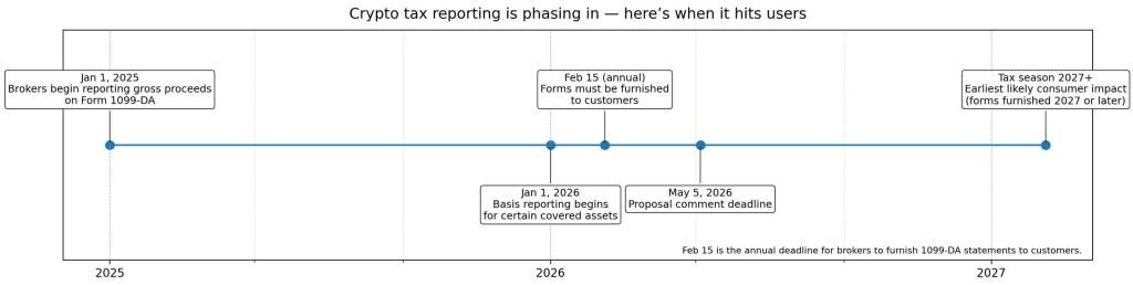 Timeline shows crypto tax reporting phases in from January 2025 through potential 2027 consumer impact of electronic-only delivery.